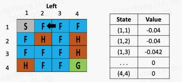 等到了下个时刻,骰子告诉我们要往左走,此时就需要更新(1,2)的Q-value,计算式为:V(s) = 0 +0.1× -0.4 + 0.5× (-0.04)-0)