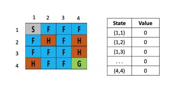 将一个结冰的湖看成是一个4×4的方格,每个格子可以是起始块(S),目标块(G)、冻结块(F)或者危险块(H),目标是通过上下左右的移动,找出能最快从起始块到目标块的最短路径来,同时避免走到危险块上,(走到危险块就意味着游戏结束)为了引入随机性的影响,还可以假设有风吹过,会随机的让你向一个方向漂移。