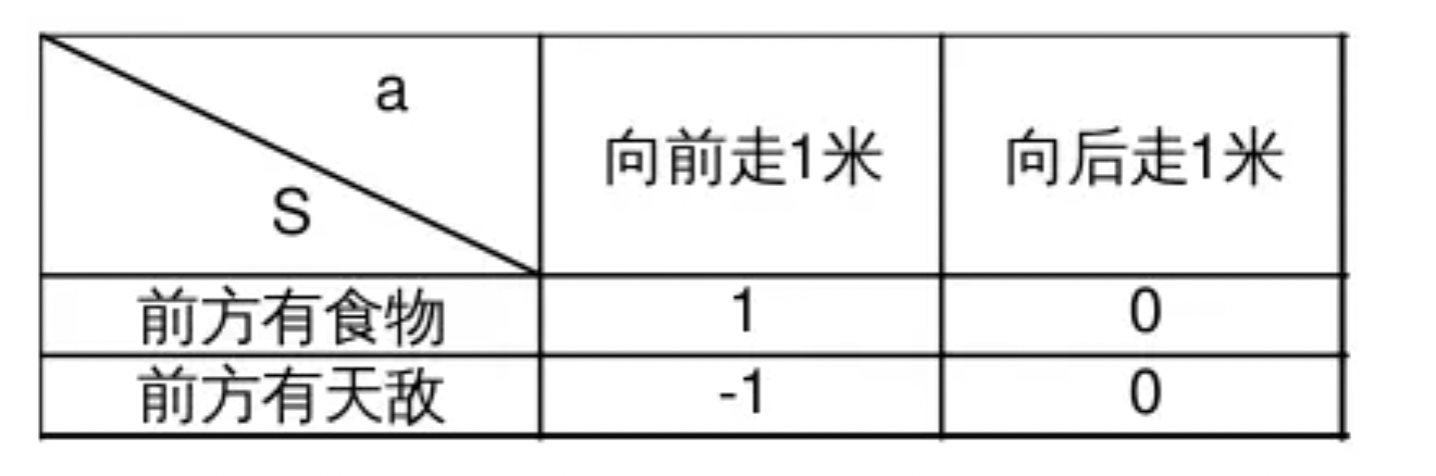 Q-Learning假设可能出现的动作a和状态S是有限多,这时a和S的全部组合也是有限多个,并且引入价值量Q表示智能体认为做出某个a时所能够获得的利益。在这种假设下,智能体收到S,应该做出怎样的a,取决于选择哪一个a可以产生最大的Q。下面的表格显示了动物在面对环境的不同状态时做出的a对应着怎样的Q,这里为了简单说明只分别列举了2种S和a: