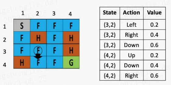 假设现在智能体到达了如图5所示的位置,现在要做的是根据公式,更新(3,2)这里的Q value,由于向下走的Q-value最低,假定学习率是0.1,折现率是0.5,那么(3,2)这个点向下走这个策略的更新后的Q value就是: