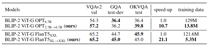 如表 2 所示,我们的 VPGTrans 在大规模场景下依然有效。通过 OPT-2.7B 到 OPT-6.7B 的迁移,我们仅用 10.8% 的数据和不到 10% 的训练时长达到了相似或更优的效果。尤其是,我们的方法在 BLIP-2 以 FlanT5XXL 为基座 LLM 下实现了 5% 左右的训练成本控制。