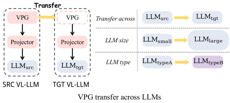 在这项工作中,我们对 VPG 在 LLM 之间的可迁移性问题进行了全面调查。我们首先探讨了最大化迁移效率的关键因素。基于关键观察,我们提出了一种新颖的两阶段迁移框架,即 VPGTrans。它可以在显著降低训练成本的同时,实现相当或更好的性能。通过 VPGTrans,我们实现了从 BLIP-2 OPT-2.7B 到 BLIP-2 OPT-6.7B 的 VPG 迁移。相较于从零开始连接 VPG 到 OPT 6.7B,VPGTrans 仅需 10.7% 训练数据和不到 10% 的训练时长。此外,我们展示并讨论了一系列有趣发现及其背后的可能原因。最后,我们通过训练 VL-LLaMA 和 LL-Vicuna,展示了我们的 VPGTrans 在定制新的 VL-LLM 方面的实际价值。