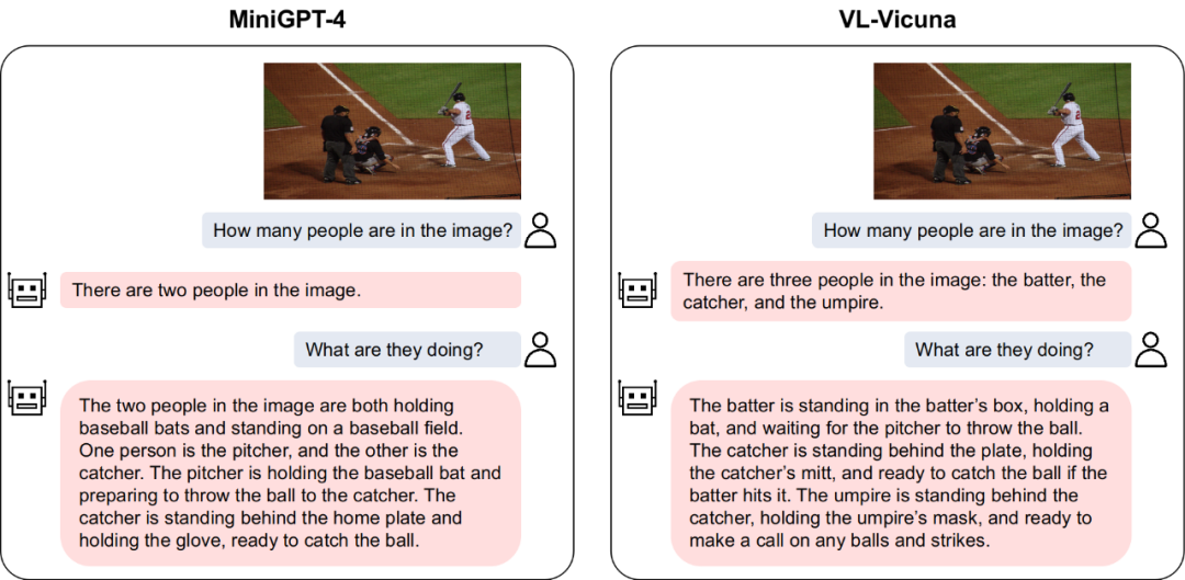 同时,我们的 VL-Vicuna 可以进行多模态对话。我们和 MiniGPT-4 进行了简单的比较: