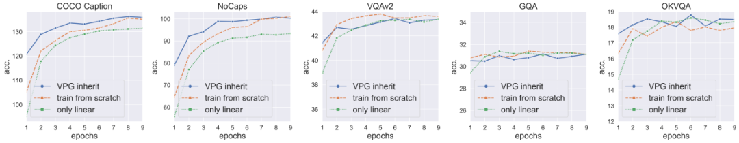 图 5:VPG inherit (蓝线): 直接继承训练好的 VPG。train from scratch (橘线):从头训练 VPG。only linear (绿线):只训练 linear projector 不训练 VPG。