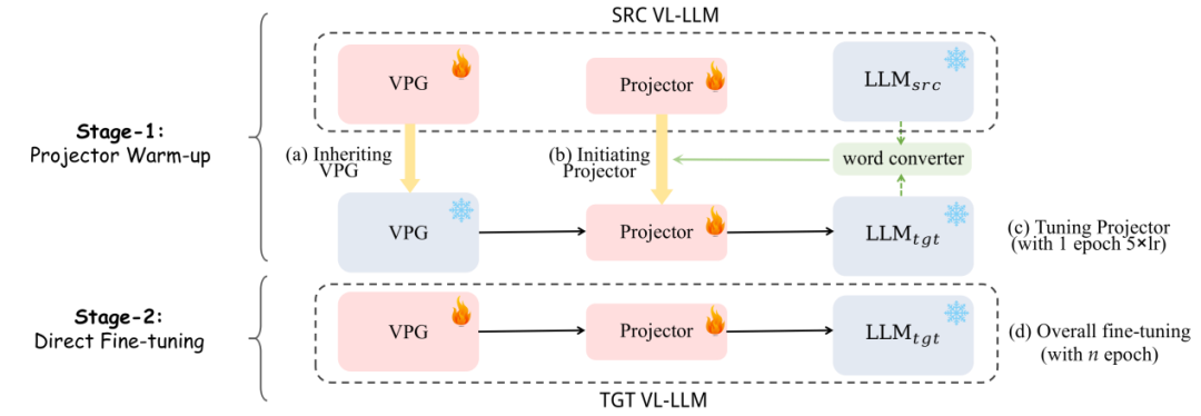 (1) 第一阶段:我们首先使用词向量转化器和原有 projector 进行融合作为新 projector 的初始化。然后用 5 倍学习率训练新 projector 一个 epoch。
