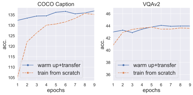图 6: 先 warm-up 训练 projector 可以防止掉点 + 加速收敛