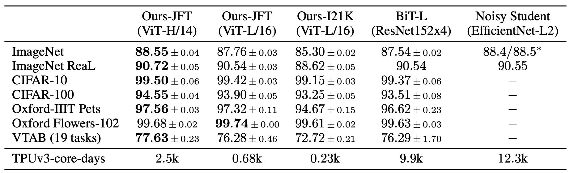 return xViT模型在常用数据集上进行迁移学习,最终指标如 图10 所示。可以看到,在ImageNet上,ViT达到的最高指标为88.55%;在ImageNet ReaL上,ViT达到的最高指标为90.72%;在CIFAR100上,ViT达到的最高指标为94.55%;在VTAB(19 tasks)上,ViT达到的最高指标为88.55%。