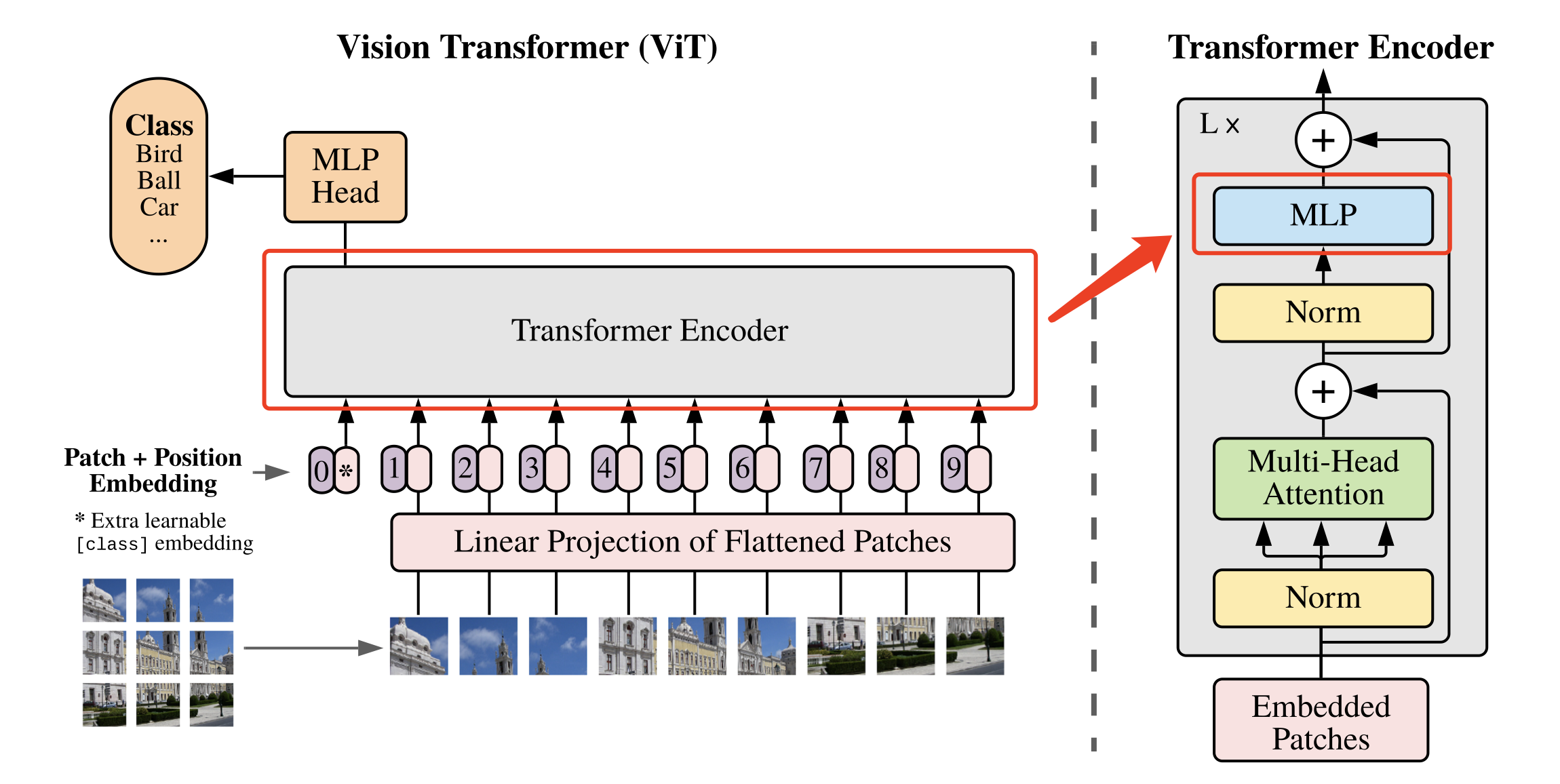 得到输出后,ViT中使用了 MLP Head对输出进行分类处理,这里的 MLP Head 由 LayerNorm 和两层全连接层组成,并且采用了 GELU 激活函数。