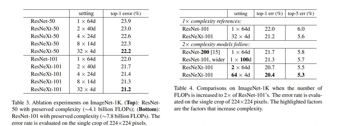 上图是ResNet与ResNeXt的参数对比,可以看出,ResNeXt与ResNet几乎是一模一样的参数量和计算量,然而两者在ImageNet上的表现却不一样。