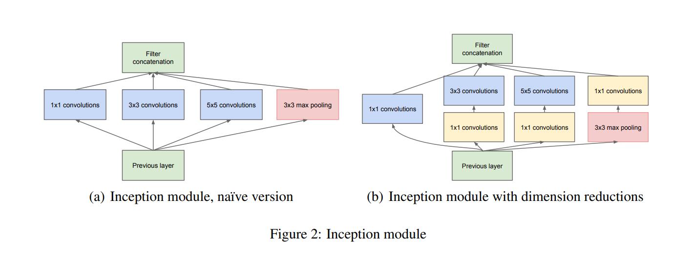 下图是InceptionNet的两种inception module结构,左边是inception module的naive版本,右边是使用了降维方法的inception module。相较于右边,左边很明显的缺点就是参数大,计算量巨大。使用不同大小的卷积核目的是为了提取不同尺度的特征信息,对于图像而言,多尺度的信息有助于网络更好地对图像信息进行选择,并且使得网络对于不同尺寸的图像输入有更好的适应能力,但多尺度带来的问题就是计算量的增加。因此在右边的模型中,InceptionNet很好地解决了这个问题,首先是1×1的卷积用于特征降维,减小特征的通道数后再采取多尺度的结构提取特征信息,在降低参数量的同时捕获到多尺度的特征信息。