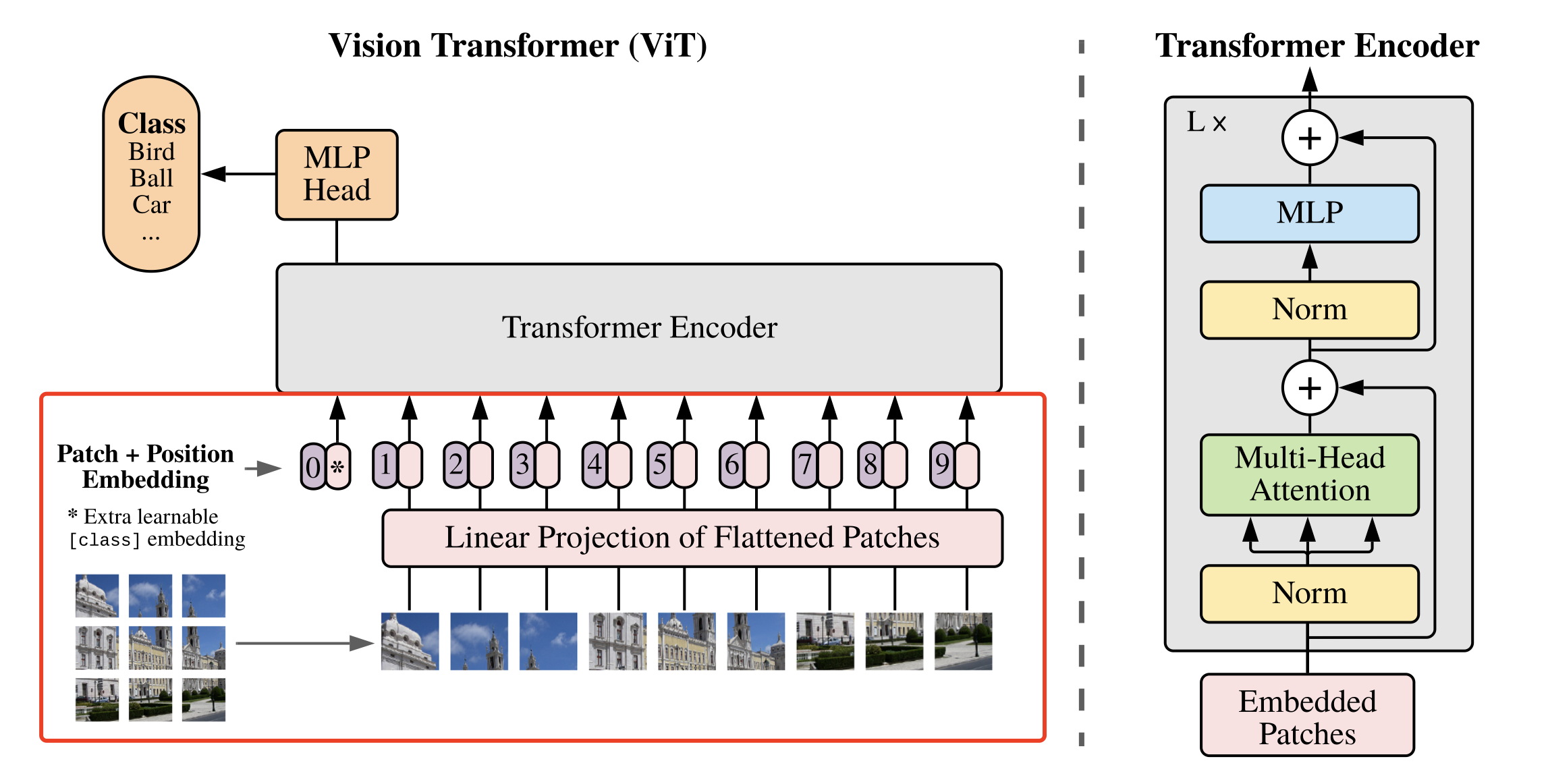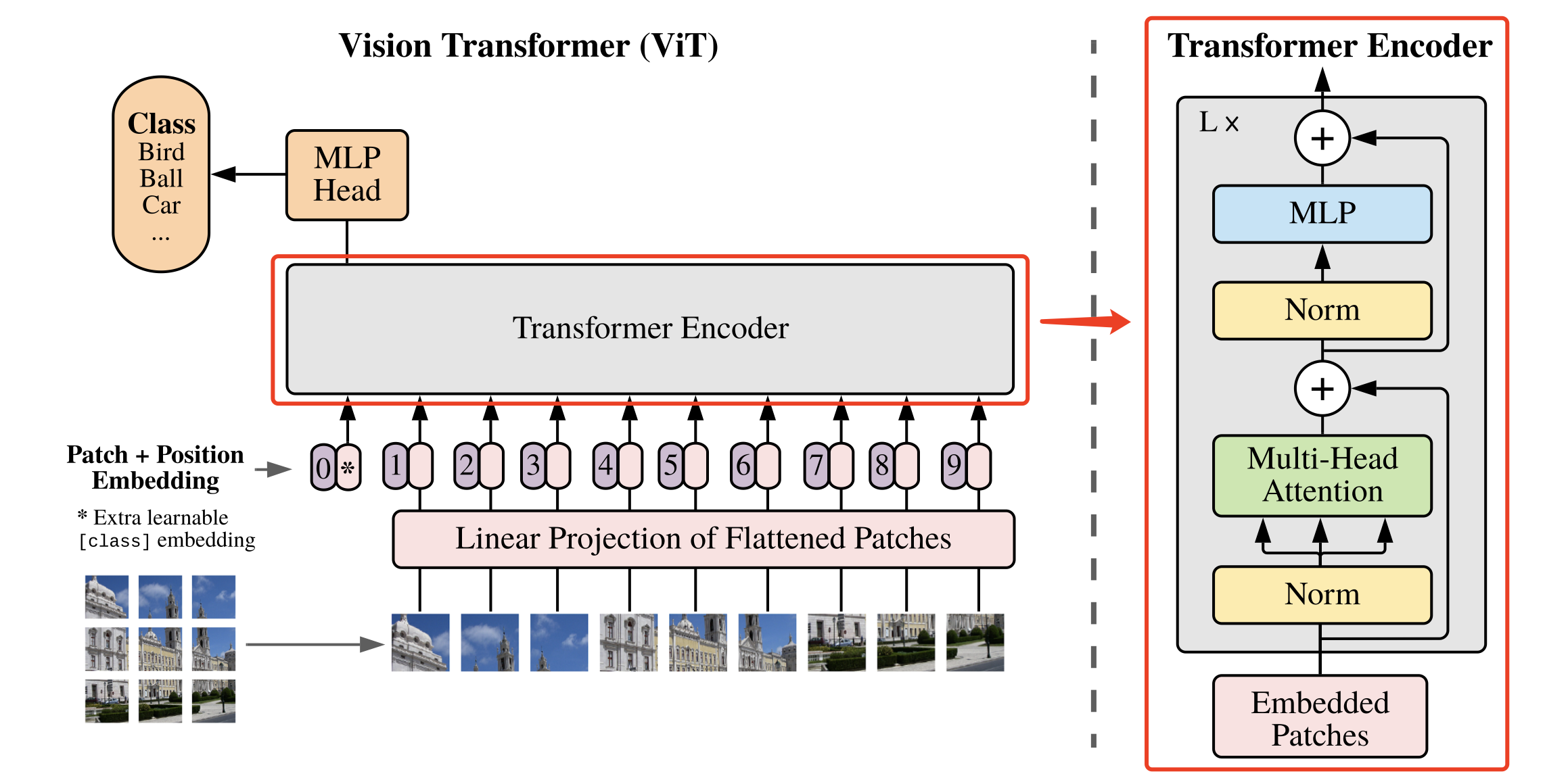 我们可以想象,如果没有这个向量,也就是将 $N=9$ 个向量输入 Transformer 结构中进行编码,我们最终会得到9个编码向量,可对于图像分类任务而言,我们应该选择哪个输出向量进行后续分类呢?因此,ViT算法提出了一个可学习的嵌入向量 Class Token,将它与9个向量一起输入到 Transformer 结构中,输出10个编码向量,然后用这个 Class Token 进行分类预测即可。