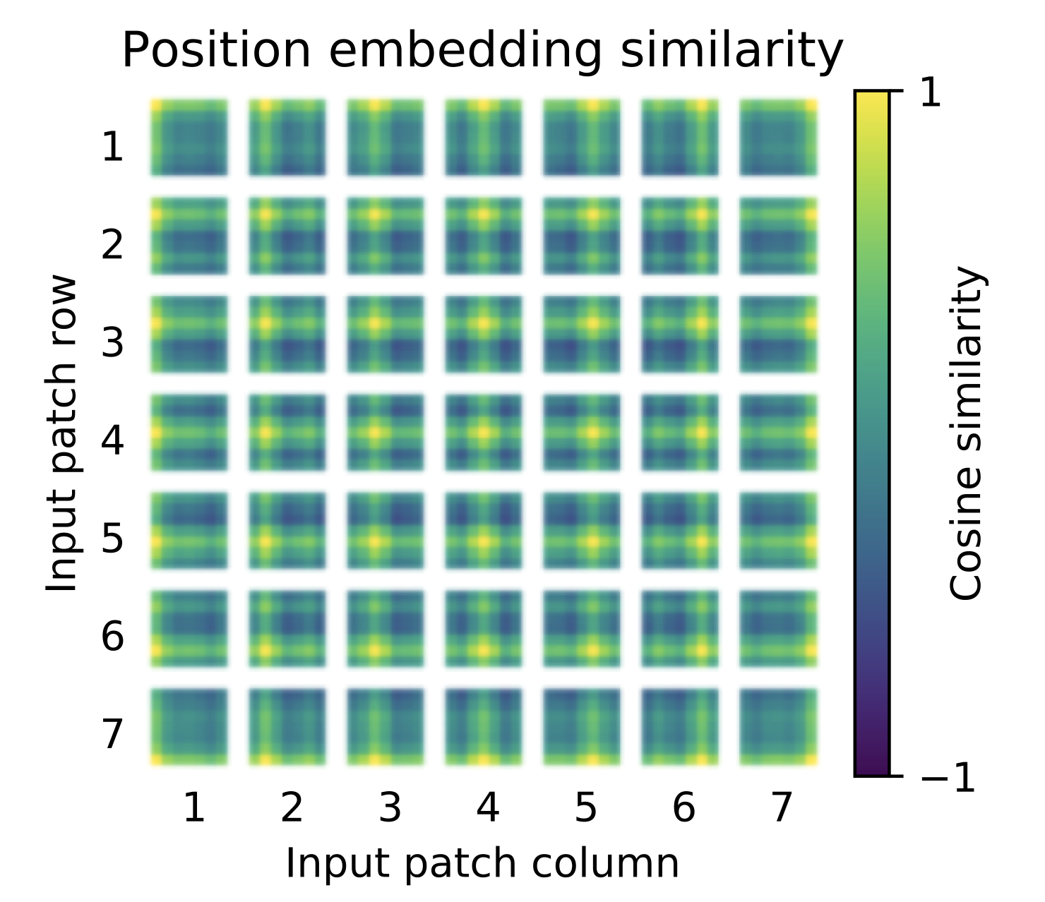 按照 Transformer 结构中的位置编码习惯,这个工作也使用了位置编码。不同的是,ViT 中的位置编码没有采用原版 Transformer 中的 $sincos$ 编码,而是直接设置为可学习的 Positional Encoding。对训练好的 Positional Encoding 进行可视化,如 图9 所示。我们可以看到,位置越接近,往往具有更相似的位置编码。此外,出现了行列结构,同一行/列中的 patch 具有相似的位置编码。