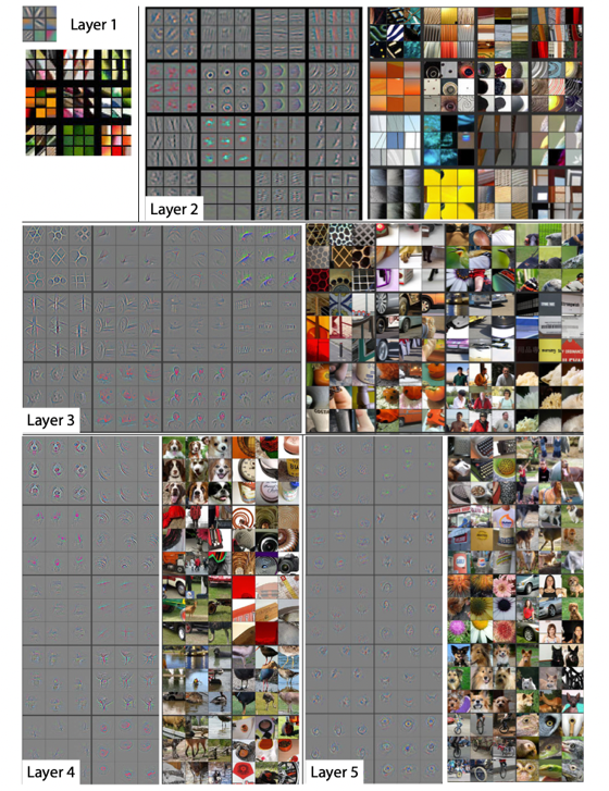 从理论上来讲,加深深度学习网络可以提升性能。深度网络以端到端的多层方式集成了低/中/高层特征和分类器,且特征的层次可通过加深网络层次的方式来丰富。举一个例子,当深度学习网络只有一层时,要学习的特征会非常复杂,但如果有多层,就可以分层进行学习,如 图1 所示,网络的第一层学习到了边缘和颜色,第二层学习到了纹理,第三层学习到了局部的形状,而第五层已逐渐学习到全局特征。网络的加深,理论上可以提供更好的表达能力,使每一层可以学习到更细化的特征。