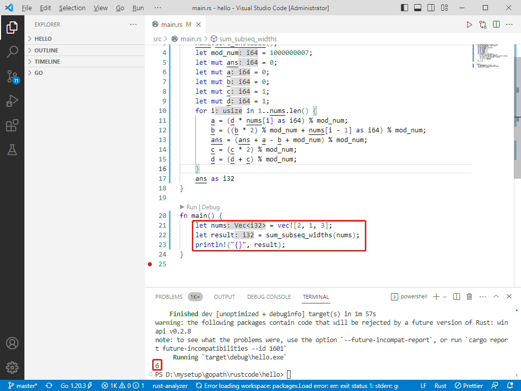 B = ((B*2)%int64(mod) + int64(nums[i-1])) % int64(mod)