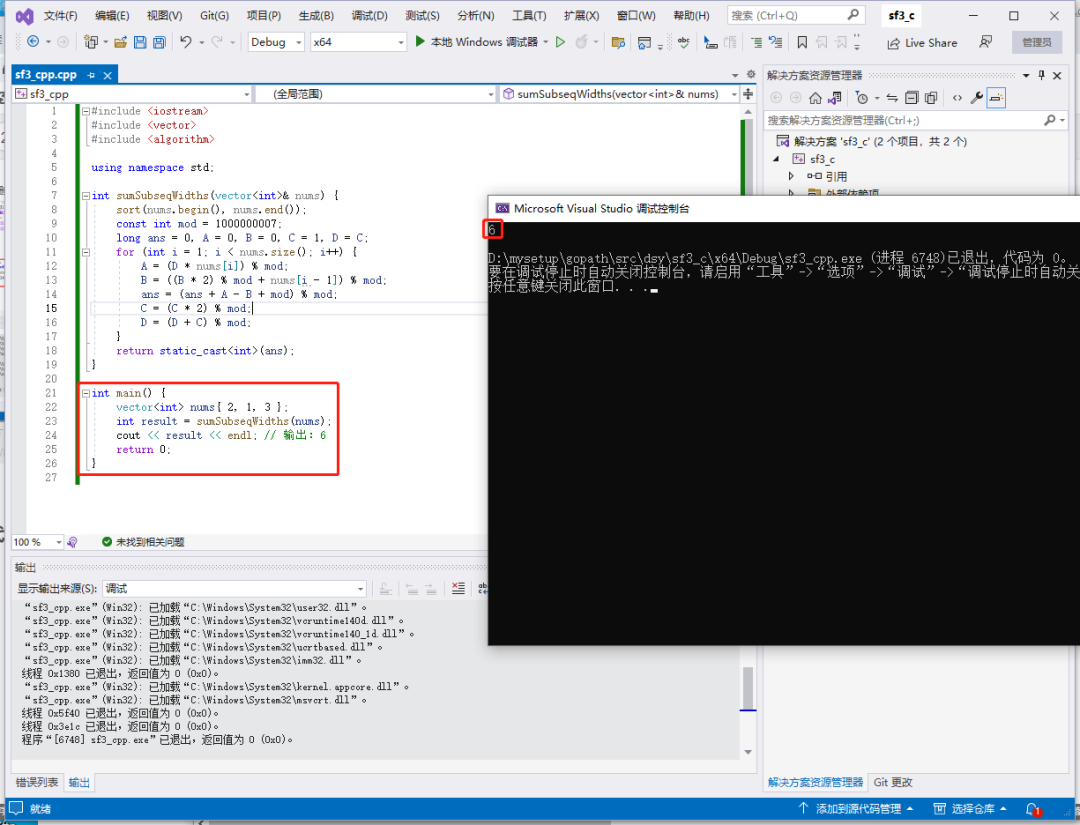 2023-04-29:一个序列的 宽度 定义为该序列中最大元素和最小元素的差值。给你一个整数数组 nums ,返回 nums 的所有非空 子序列 的 宽度之和 由于答案可能非常大,请返回对 109 + 7 取余 后的结果。子序列 定义为从一个数组里删除一些(或者不删除)元素, 但不改变剩下元素的顺序得到的数组 例如,[3,6,2,7] 就是数组 [0,3,1,6,2,2,7] 的一个子序列。输入:nums = [2,1,3]。输出:6。
