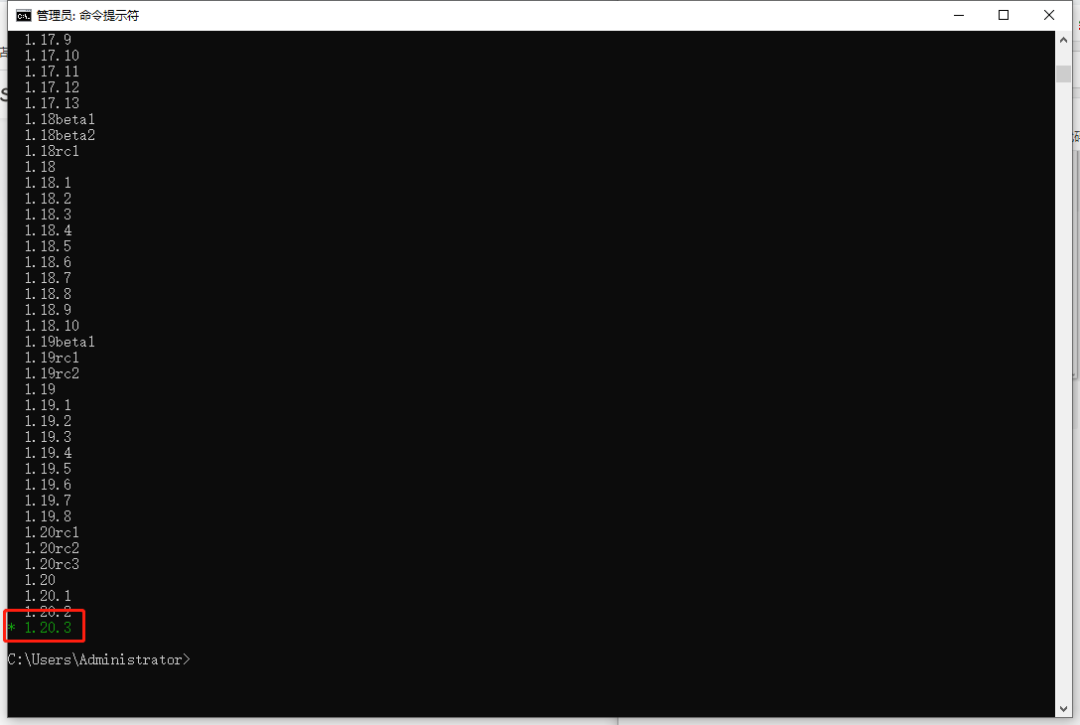 可以看到,现在已经安装了1.19版本,并且切换到1.19环境了。安装某个版本会自动切换到某个版本。