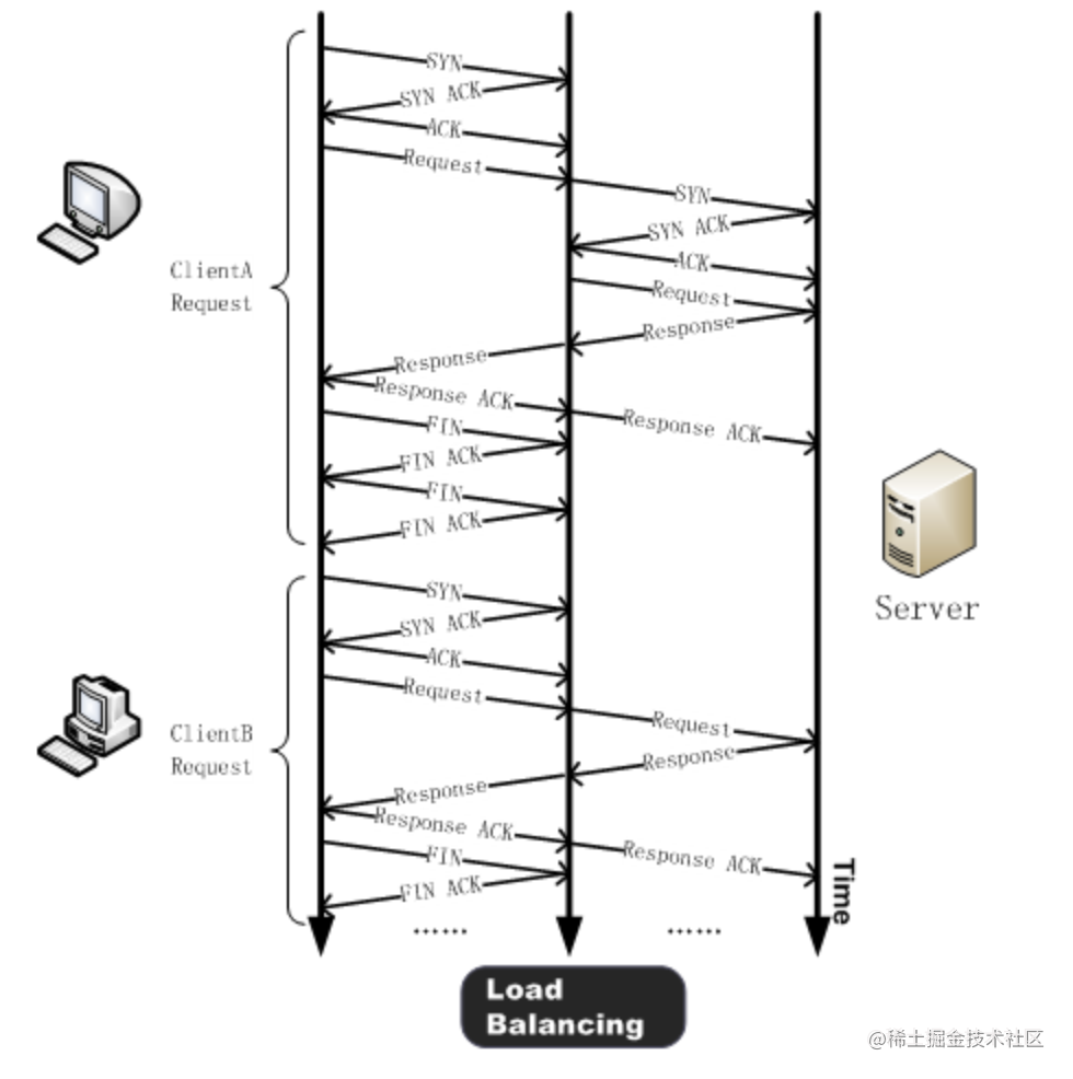 基本原理:客户端(如:ClientA)与负载均衡设备之间进行三次握手并发送 HTTP 请求。负载均衡设备收到请求后,会检测服务器是否存在空闲的长链接,如果不存在,服务器将建立一个新连接。当 HTTP 请求响应完成后,客户端与负载均衡设备协商关闭连接,而负载均衡则保持与服务器之间的这个连接。当有其他客户端(如:ClientB)需要发送 HTTP 请求时,负载均衡设备会直接向服务器之间保持的这个空闲连接发送 HTTP 请求,避免来由于新建 TCP 连接造成的延时和服务器资源耗费。