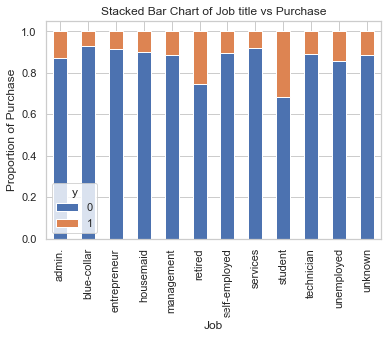 plt.title('Stacked Bar Chart of Job title vs Purchase')