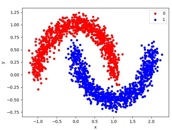 12345678 | X, y = make_moons(n_samples=2000, noise=0.1)# 散点图,按分类值着色df = DataFrame(dict(x=X:,0, y=X:,1, label=y))fig, ax = pyplot.subplots()grouped = df.groupby('label')for key, group in grouped: group.plot(ax=ax, kind='scatter', x='x', y='y', label=key, color=colorskey)pyplot.show() |