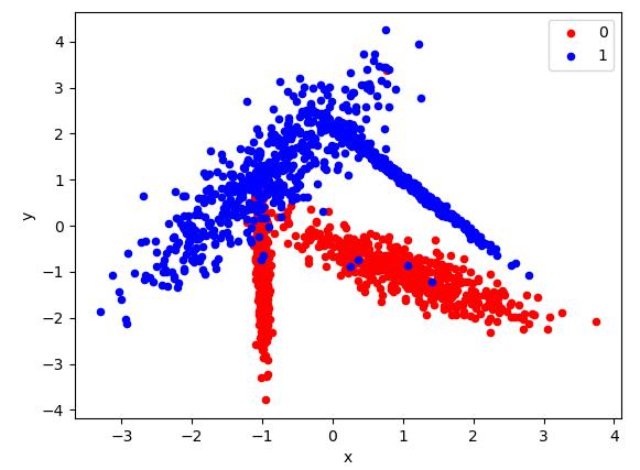 12345678 | X, y = make_classification(2000, n_features=2, n_informative=2, n_redundant=0, n_classes=2, n_clusters_per_class=2)# 散点图,按分类值着色df = DataFrame(dict(x=X:,0, y=X:,1, label=y))fig, ax = pyplot.subplots()grouped = df.groupby('label')for key, group in grouped: group.plot(ax=ax, kind='scatter', x='x', y='y', label=key, color=colorskey)pyplot.show() |