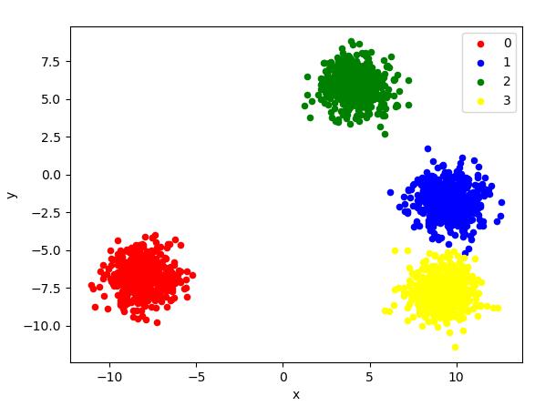 12345678 | X, y = make_blobs(n_samples=2000, centers=4, n_features=2)# 散点图,按分类值着色df = DataFrame(dict(x=X:,0, y=X:,1, label=y))fig, ax = pyplot.subplots()grouped = df.groupby('label')for key, group in grouped: group.plot(ax=ax, kind='scatter', x='x', y='y', label=key, color=colorskey)pyplot.show() |