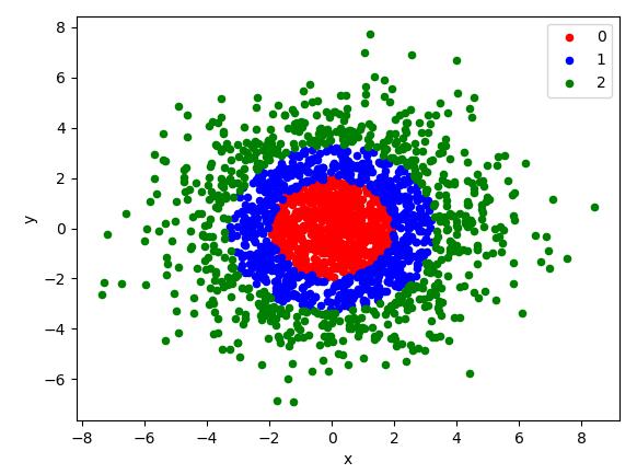 12345678 | X, y = make_gaussian_quantiles(mean=0,0, cov=5,5, n_samples=2000)# 散点图,按分类值着色df = DataFrame(dict(x=X:,0, y=X:,1, label=y))fig, ax = pyplot.subplots()grouped = df.groupby('label')for key, group in grouped: group.plot(ax=ax, kind='scatter', x='x', y='y', label=key, color=colorskey)pyplot.show() |