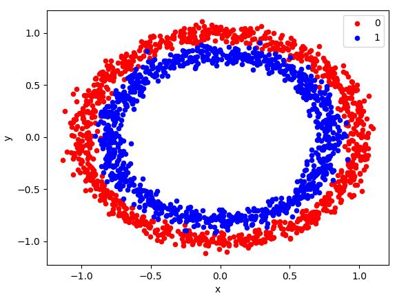 12345678 | X, y = make_circles(n_samples=2000, noise=0.05)# 散点图,按分类值着色df = DataFrame(dict(x=X:,0, y=X:,1, label=y))fig, ax = pyplot.subplots()grouped = df.groupby('label')for key, group in grouped: group.plot(ax=ax, kind='scatter', x='x', y='y', label=key, color=colorskey)pyplot.show() |