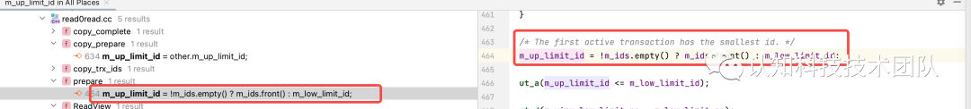 为当前活跃事务中的最小事务ID,如果当前无活跃事务,为m_low_limit_id值。