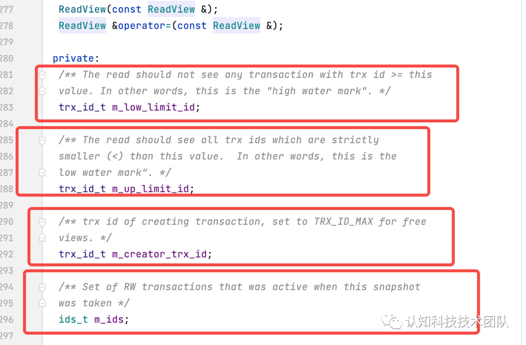 为当前生成ReadView的事务时,当前活跃的读写事务ID列表。如果当前数据版本的事务ID在m_ids中,表明生成ReadView的事务时,此版本的数据还没被事务提交,当前事务不可访问。如果当前数据版本的事务ID不在m_ids中,表明生成ReadView的事务时,此版本的数据是被提交,当前事务可以访问。