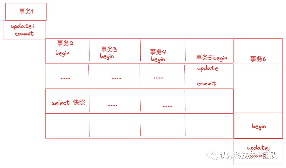 事务1~6的执行时间顺序按序号依次开始,当事务2执行普通select查询,生成快照读视图,在事务2结束之前不变(InnoDB引擎在默认隔离级别可重复读情况)。