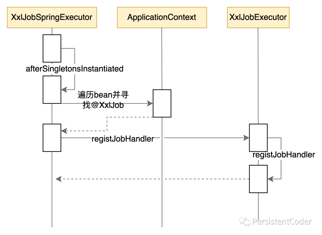 }这个为什么能生效,我们需要了解下调度器注册原理,我们使用的是XxlJobSpringExecutor,其实现了ApplicationContextAware和SmartInitializingSingleton接口,在bean实例化之后会调用重写的afterSingletonsInstantiated方法: