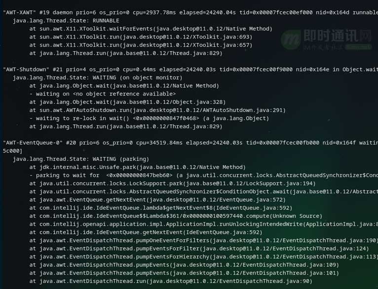 按照惯例,先打印一下线程栈,会发现鼠标、键盘等事件的监听是由“AWT-XAWT”线程负责的,处理事件则是“AWT-EventQueue”线程负责。如下图所示。