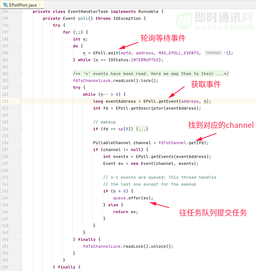 注:注册事件调用EPoll.ctl(...)函数,这个函数在最后的参数用于指定是一次性的,还是永久性。上面代码events | EPOLLONSHOT字面意思看来,是一次性的。