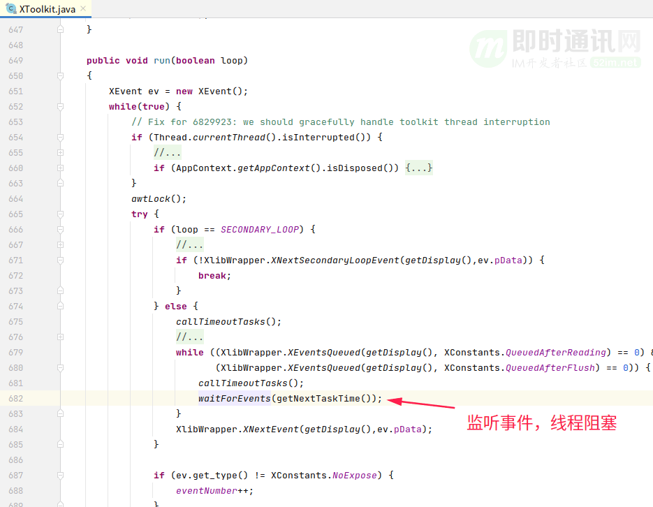 定位到具体的代码上:可以看到“AWT-XAWT”正在做while循环,调用waitForEvents函数等待事件返回。如果没有事件,线程就一直阻塞在那边。如下图所示。