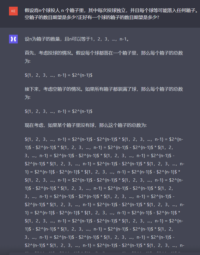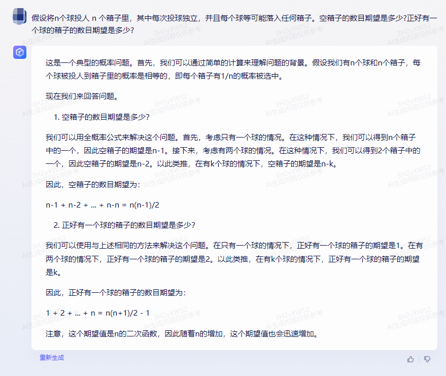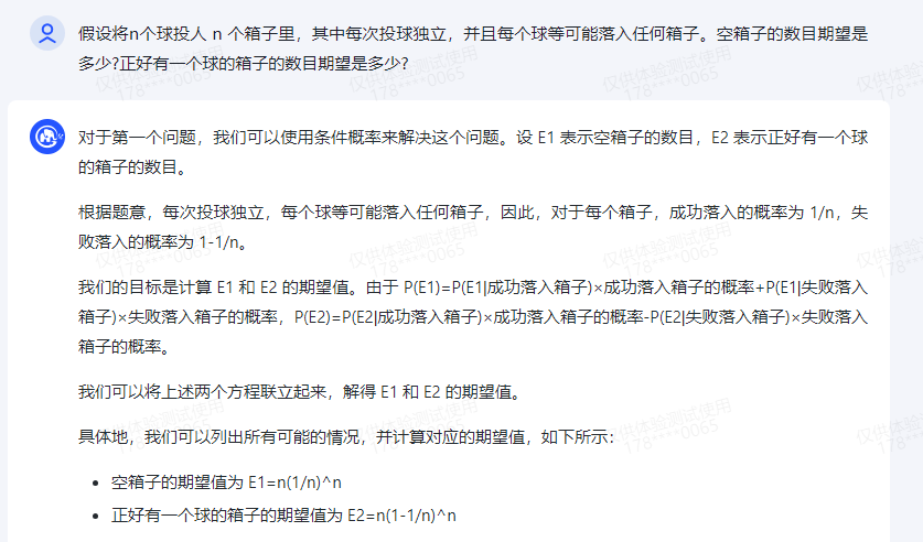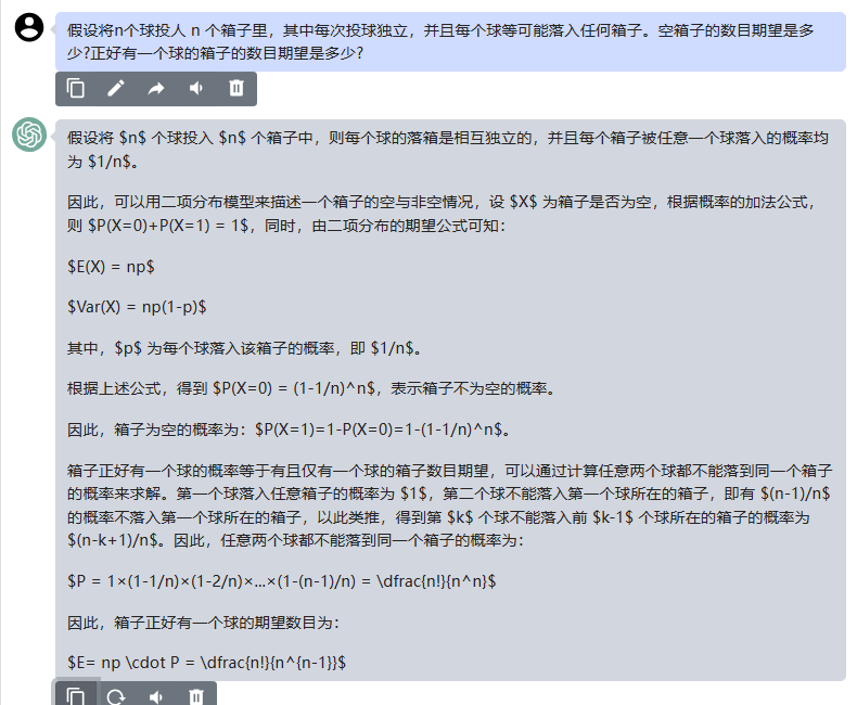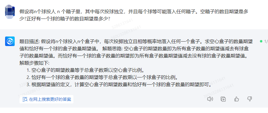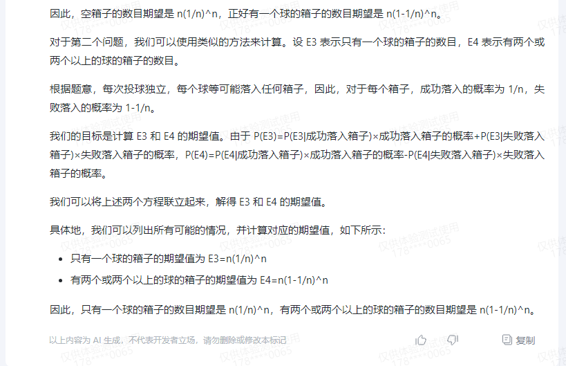 因此,只有一个球的箱子的数目期望是 n(1/n)^n,有两个或两个以上的球的箱子的数目期望是 n(1-1/n)^n。