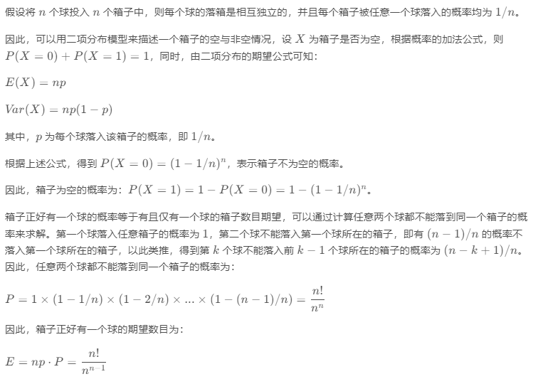 假设将 n 个球投入 n 个箱子中,则每个球的落箱是相互独立的,并且每个箱子被任意一个球落入的概率均为 1/n。