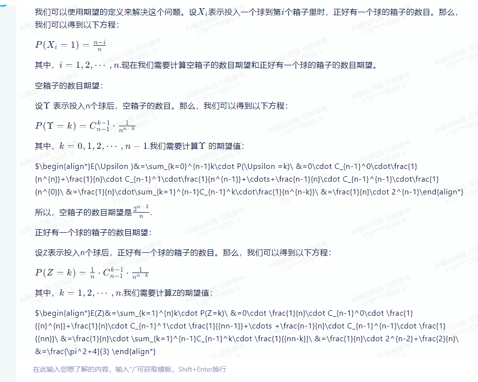 我们可以使用期望的定义来解决这个问题。设X_i表示投入一个球到第i个箱子里时,正好有一个球的箱子的数目。那么,我们可以得到以下方程: