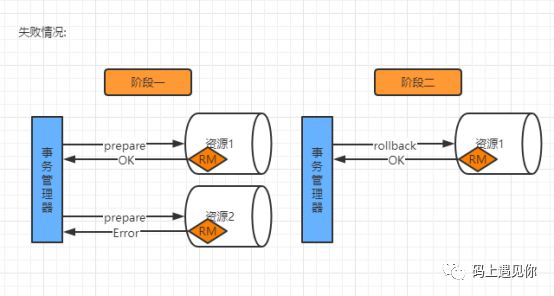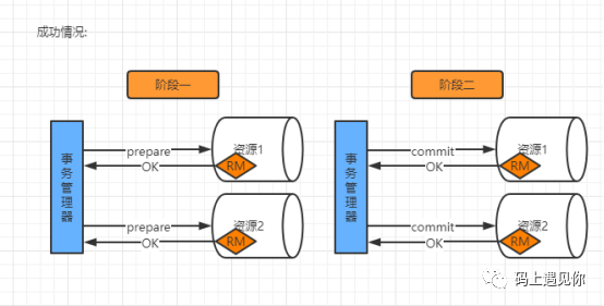 在提交阶段TM会接受RM在准备阶段的执行回复,只要有任一个RM执行失败,TM会通知所有RM执行回滚操 作,否则,TM将会通知所有RM提交该事务。提交阶段结束资源锁释放。