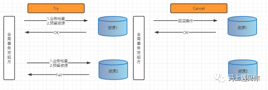 3. Cancel阶段是业务执行错误需要回滚的状态下执行分布式事务的业务取消。预留资源释放,通常情况下 采用TCC则认为Cancel是一定成功的。若Cancel阶段真的出错了,也需要Confirm一样进行处理