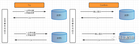 1. Try阶段是做业务检查(一致性)及资源预留(隔离),此阶段仅是初步操作,它和后续的Confirm操作一起才能真正构成一个完整的业务逻辑。