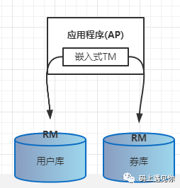 2. AP通过TM通知用户库RM新增用户,同时通知券库RM为该新增用户新增优惠券,RM此时并未提交事务,此时用户资源和优惠券资源暂时锁定