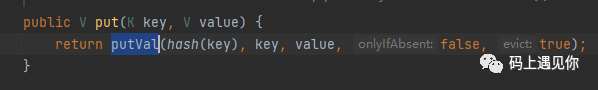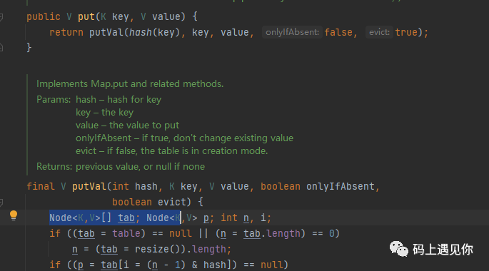 追put()方法时不难发现;put()里面有个putVal(),putVal()里面得到一个key和value,把key和value做了一个Node放到了我们这个HashMap里面去