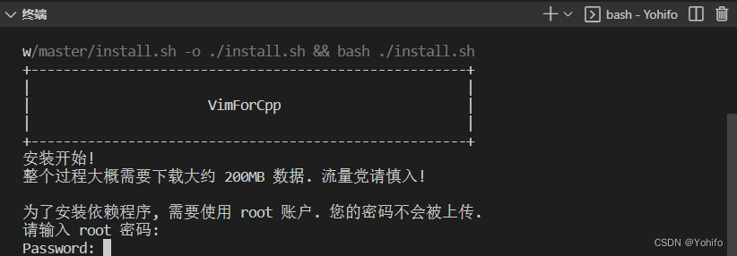 curl -sLf https://gitee.com/HGtz2222/VimForCpp/raw/master/install.sh -o ./install.sh && bash ./install.shroot 密码,因为安装需要借助 root 权限ctrl+c 强制终止,然后重新安装