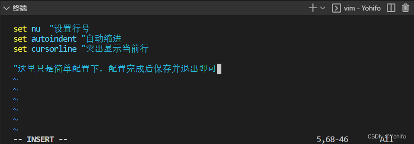 set nu 设置行号set autoindent 自动缩进set cursorline 突出显示当前行注意: 是在自己的 ~ 路径下创建 .vimrc 文件,这个配置只对当前用户生效,推荐这样做,毕竟是属于自己的个性化设置