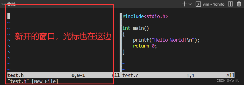 注意: 窗口理论上来说可以开辟无数个,但如果开的多了,是非常不好操作的,如果你用的是一块横放的带鱼屏,因此我们一般只会打开2~3个窗口使用。窗口可以有很多个,但光标永远只有一个,当打开新窗口时,光标也会跟着过去,如果想实现光标在不同窗口间的切换,只需要使用 ctrl+ww 即按住 ctrl 的同时快速点击 w 两次