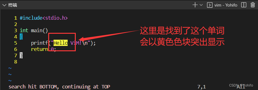 我们可以在底行模式下,搜索文本内的单词,假设我们想搜索 Hello 这个单词,只需要先进入底行模式,输入 /Hello 就可以在文本中查找单词了