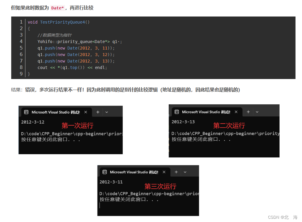 通常情况下,模板可以帮我们实现一些与类型无关的代码,但在某些场景中,【泛型】无法满足调用方的精准需求,此时会引发错误,比如使用 日期类对象指针 构建优先级队列后,若不编写对应的仿函数,则比较结果会变为未定义