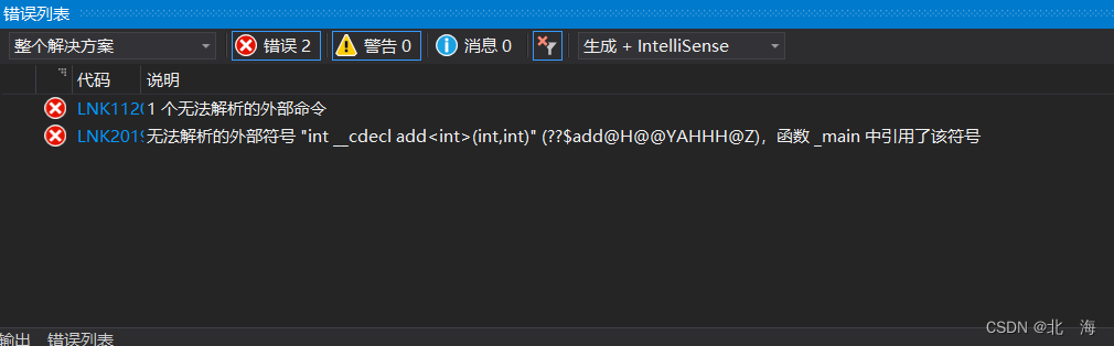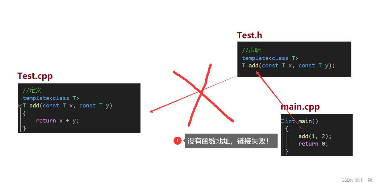 当模板的 声明 与 定义 分离时,因为是 【泛型】,所以编译器无法确定函数原型,即 无法生成函数,也就无法获得函数地址,在符号表中进行函数链接时,必然失败