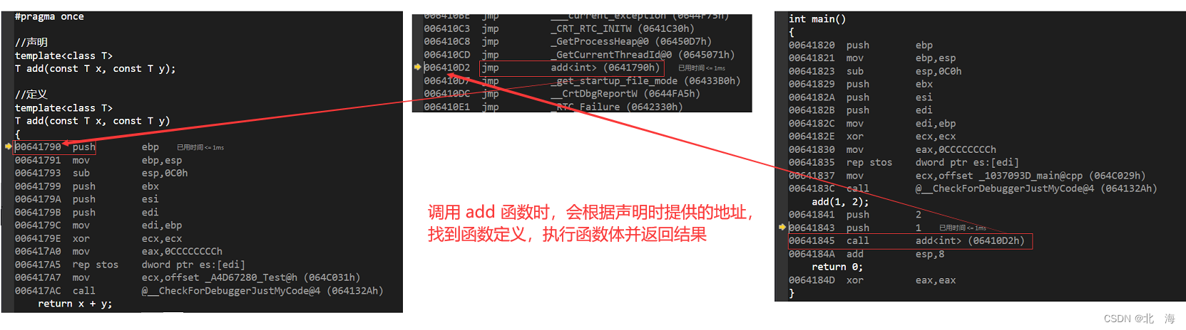 下面是 模板声明与定义写在同一个文件中时,具体的汇编代码执行步骤