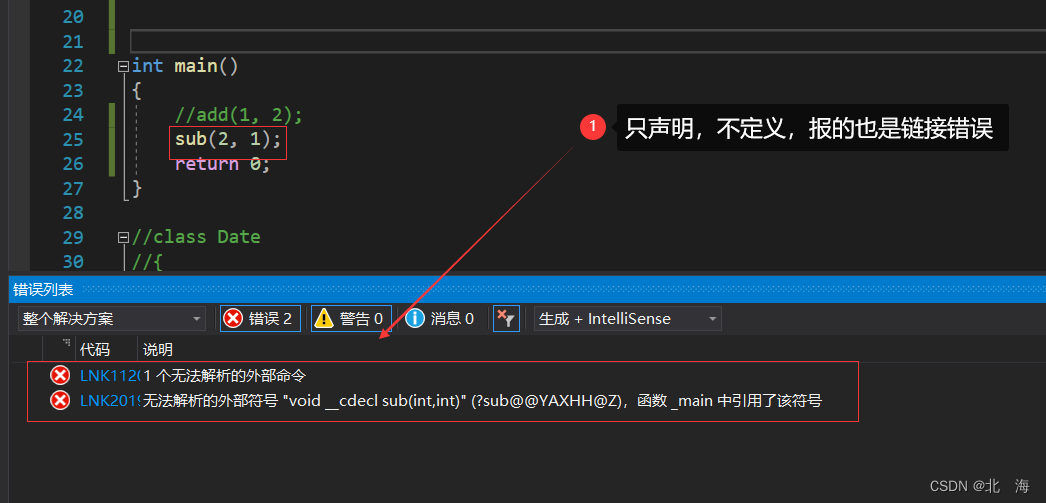 声明与定义分离后,在进行链接时,无法在符号表中找到目标地址进行跳转,因此链接错误